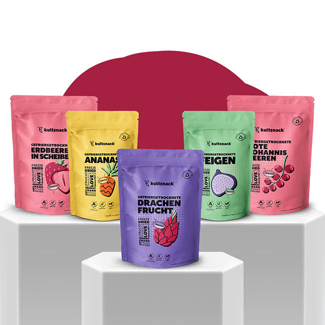 Zin in variatie, kleur en de pure smaak van fruit? Dan is het Kultsnack Proefpakket 4 precies wat je nodig hebt! Deze set bevat onze populairste gevriesdroogde vruchten: vijgen, aardbeienschijfjes, roze drakenfruit, ananas en rode bessen. Elke variëteit wordt geoogst wanneer deze optimaal rijp is en voorzichtig gevriesdroogd om vitaminen, voedingsstoffen en natuurlijke smaak perfect te behouden. Of je nu van exotisch, fruitig of subtiel zuur houdt, dit proefpakket laat je kennismaken met de heerlijkheid van natuurlijke snacks.
