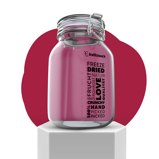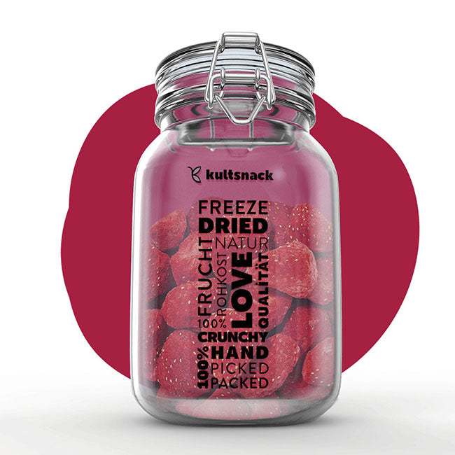 Wusstest du, dass knackig nicht gleich knackig ist? Je nachdem, welchen Feuchtigkeitsgehalt die frische Frucht hatte, wird die gefriergetrockneten Frucht knackiger oder crosser. Gefriergetrocknete Erdbeeren in Scheiben zum Beispiel sind ganz fluffig leicht, sehr knusprig, mit Kartoffelchips zu vergleichen. Sie werden meist auch sehr dünn geschnitten. Gefriergetrocknete Bananen dagegen, die in frischer Form sehr viel weniger Feuchtigkeit enthalten, sind sehr kanckig, eher wie ein Keks und fester in der Konsistenz. Gefriergetrocknete Ananas, die einen hohen Fruchtzuckeranteil besitzt, wird beim Kauen im Mund schneller weich und chewi, wogegen eine Himbeere mit der sehr leichten Konsistenz im Mund auf sehr angenehme Weise fast zerfällt. Aber egal, wie welche Frucht knackt und cruncht, eines haben sie alle gemeinsam: wenn sie richtig gut und dicht verpackt werden, dann ist der Knabberspaß fast unendlich. Dabei sind die Früchte in unseren wiederverschließbaren Beuteln sehr gut geschützt, aber auch in unserem Vorratsglas mit Bügelverschluss. Wichtig ist, dass du, egal welche Packung, diese schnell wieder verschließt und die Früchte so immer nur möglichst kurz mit Luft und Luftfeuchtigkeit in Berührung kommen. Viel Spaß beim Knuspern und Knabbern!