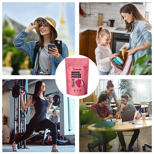 Ben je dol op de smaak van verse aardbeien? Dan zul je helemaal weg zijn van onze Super Power Poeder van Kultsnack! Gemaakt van 100% gevriesdroogde, rauwe aardbeien, boordevol natuurlijke smaken, vitaminen en kleurstoffen. Een klein lepeltje is al genoeg om je muesli, yoghurt of shake een fruitige en aromatische boost te geven. Het geeft ook een speciale touch aan het bakken, decoreren of zoeten van desserts – allemaal zonder toegevoegde suiker, gewoon pure aardbeienliefde. Natuurlijk. Heerlijk. Veelzijdig.